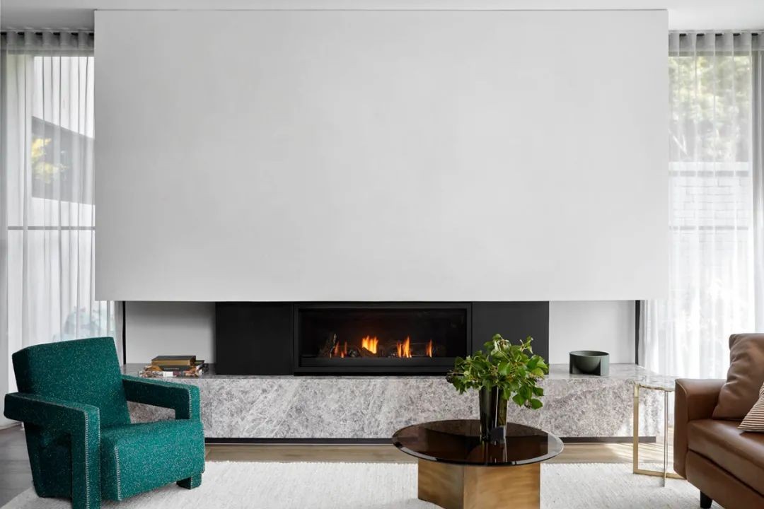 客厅的设计沉稳而精致,皮质沙发搭配毛绒地毯,细腻的质感营造了舒适的空间氛围,石纹壁炉与白墙相搭配,色调和谐统一,打造出优雅的室内设计风格。