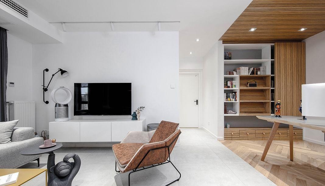 反向看过去,同样可以看到完全开放的书房空间,书房的顶面与地面采用了木作质感,在整个洁白的空间里,宛如一个延伸出去的BOX,与整体空间的感觉截然不同,但又相互和谐。