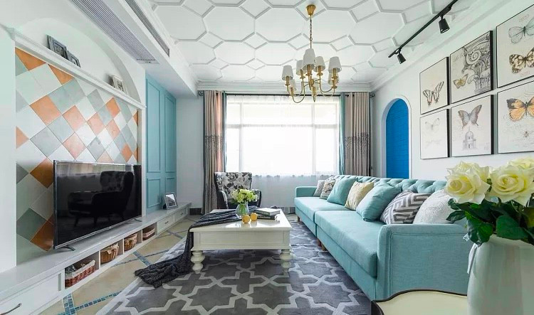 客厅电视墙左右对称墙用石膏线勾造出来的凹凸造型,刷上浅蓝色乳胶漆更有立体层次感,中间土黄拼花砖与顶部吊灯的金黄色相呼应,配以拱形的隔板架,形成客厅的视觉中心墙,沙发色与电视墙的浅蓝色统一,同一种用色让空间更和谐,顶面的石膏线拼花让高挑的客厅更丰富优雅。