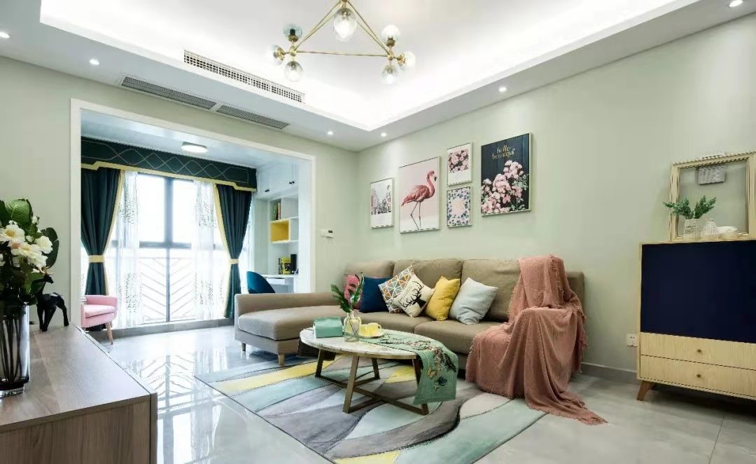 客厅浅咖色布艺沙发,搭配彩色抱枕显得活泼灵动。沙发背景墙的网红挂画营造时尚优雅的氛围。 几处粉红色和黄色点缀,灵活空间视觉又避免冷色系的单调冷硬。 将阳台空间纳入客厅,客厅变得宽敞通透了许多。