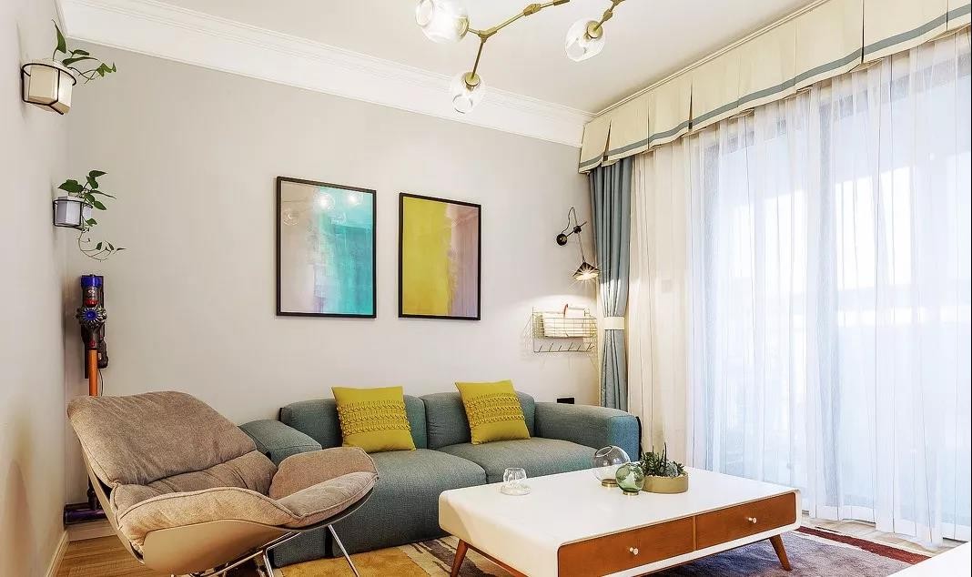 客厅布置的简单温馨,双人布艺沙发+单人摇椅+茶几,此外再无大型家具。沙发墙上悬挂的两幅装饰画,色调与沙发、抱枕的颜色一致,整个空间配色更显和谐