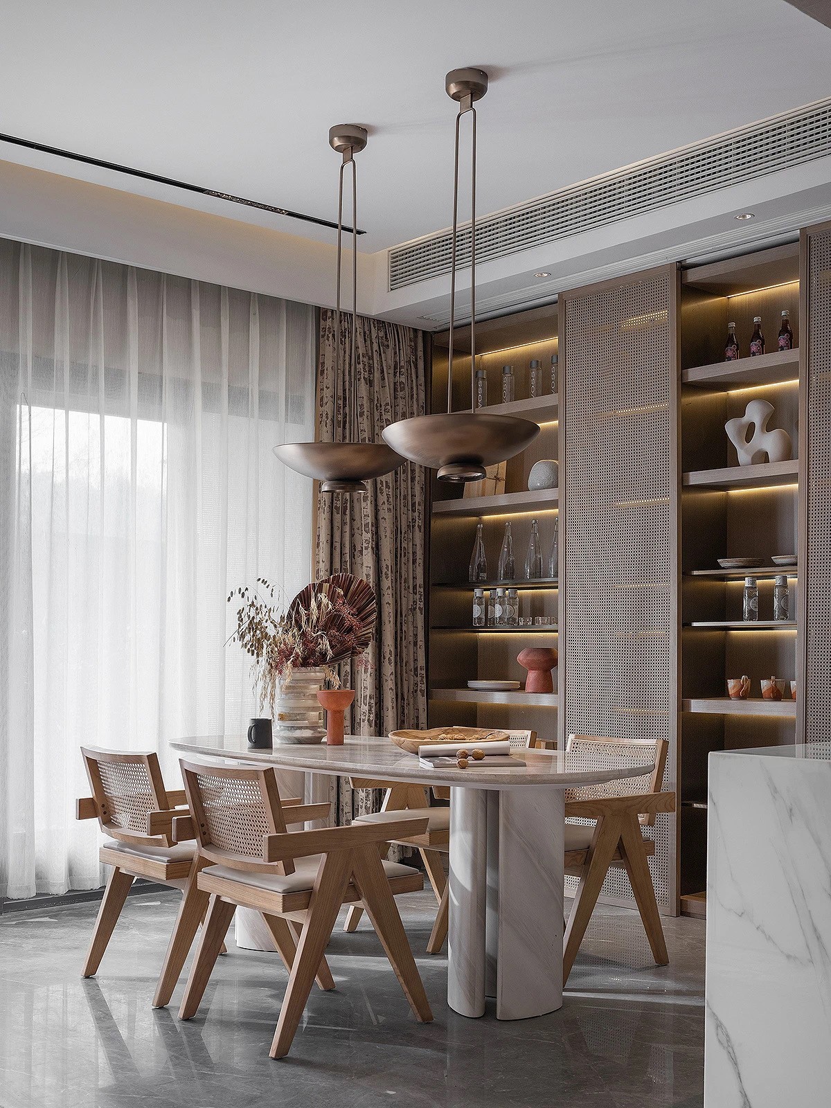轻风翻动起窗纱,吹过原木餐椅与柜门的藤编空洞,拂过石制花瓶里垂下的婀娜枝条,呼吸吐纳间,尽是自然的韵律与流动。