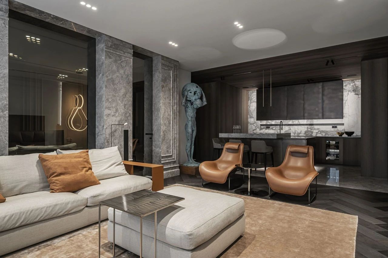 这间公寓的设计理念是在这些墙壁上实施沉稳而又微妙的男性化表现,YODEZEEN用温暖的柔和色调,石墨玻璃隔板,大量用天然石头制作的定制物品,以及真正的艺术品,创造了一个舒适和信任的氛围。
