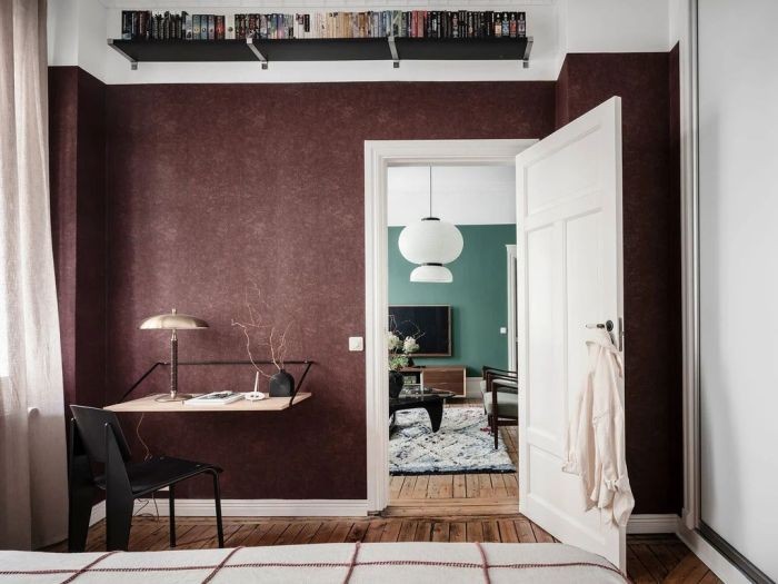 卧室的主色调是紫红色,墙面用墙纸装饰,窗帘和床品也选择了淡粉色和谐搭配,用墙面搁架代替床头柜,增加了空间的视觉轻盈感。 一侧是整墙的衣柜墙,还有办公空间。