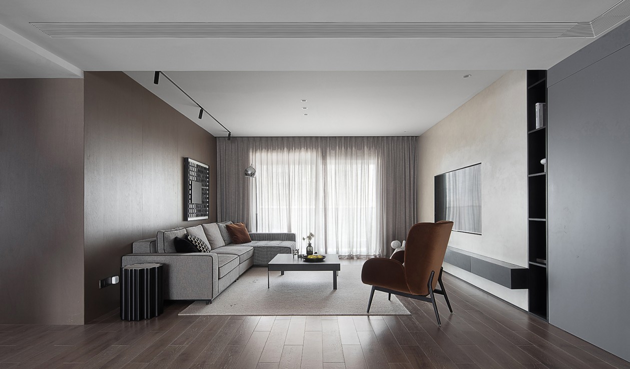空间是光影的容器,自然光穿过灰色的纱帘给起居室加了一层摩登的滤镜,适可而止的咖色又添上一笔沉稳和宁静。