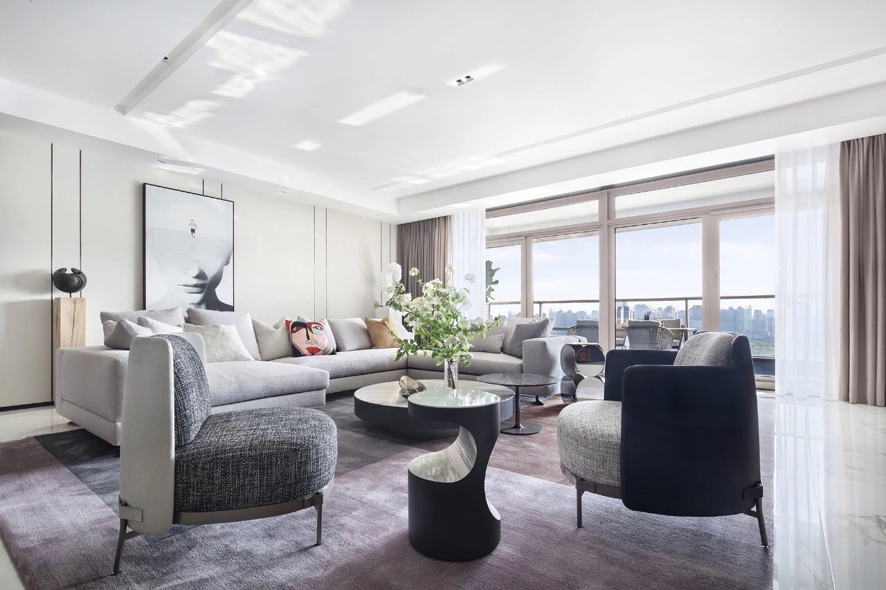 宽广开阔的落地窗把充足的阳光放进客厅空间,在富有质感的地砖折射下,似浮华过境般浸染整个画面。