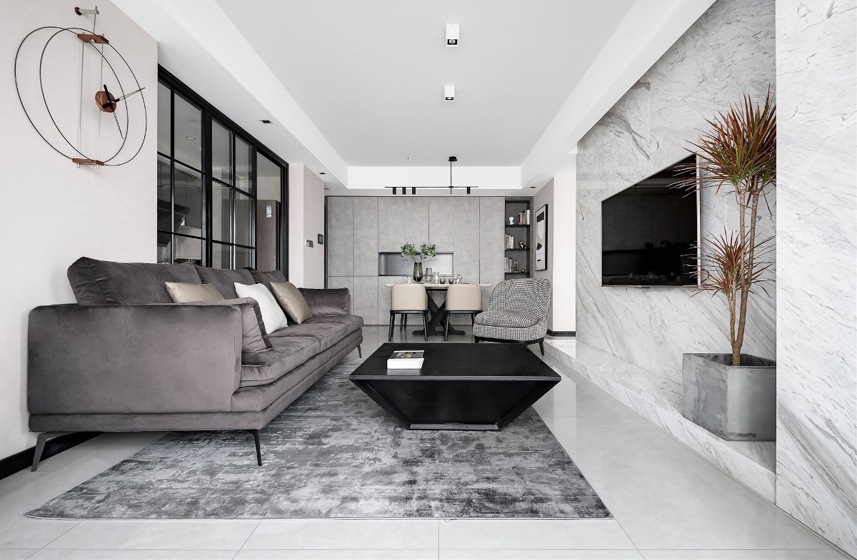 客厅的整体配色以黑白灰为基调,简单的配色往往是很经典的搭配方式,简约的设计反而能够凸显空间的质感