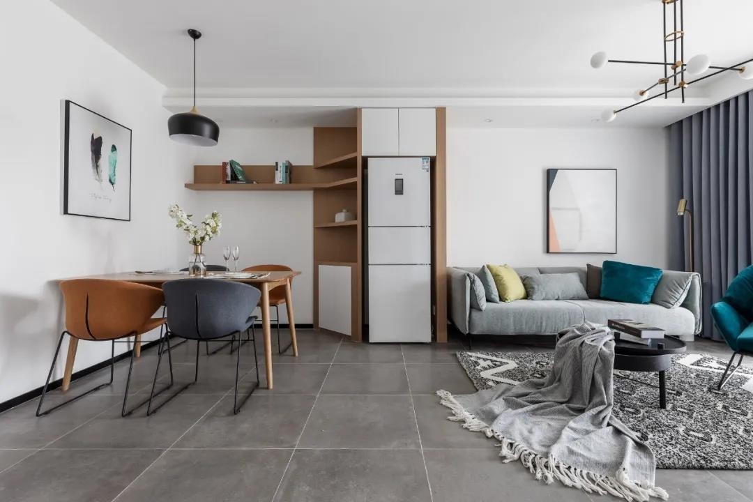 餐厅与客厅连通,冰箱柜左侧加入一个斜角的餐边柜、吊架,为小空间带来了一个灵活方便的餐边柜收纳置物位置。
