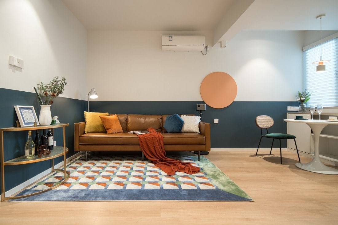 客厅用黄蓝形成撞色,皮质的沙发凳椅与绸面的抱枕发生碰撞,产生出与众不同的化学反应,完成了活泼氛围的调动。