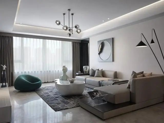 ▲客厅空间以中性色的灰调硬装,布置上现代时尚的家具陈设,搭配上一张独特的轻奢布艺懒人椅,为客厅营造出一种优雅高档的舒适氛围。