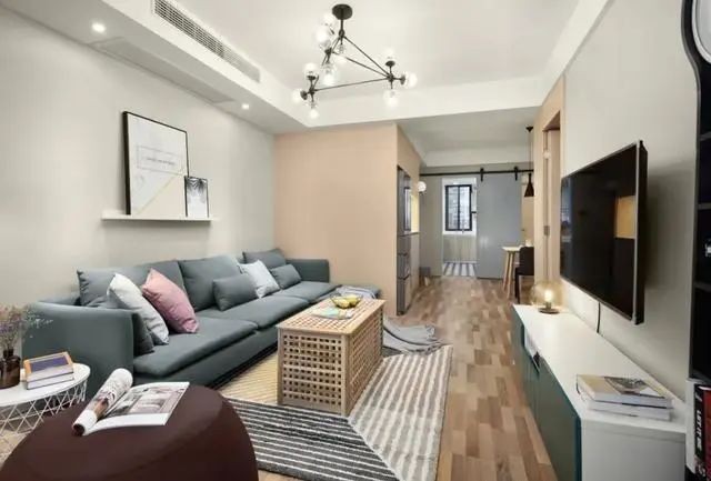 ▲客厅整体空间以暖灰色的墙面,布置灰蓝色的布艺沙发,一张独特的多头球形吊灯,还有餐厅区域的胭脂粉色的墙面,整给客厅充满了简约自然的温馨画面感。