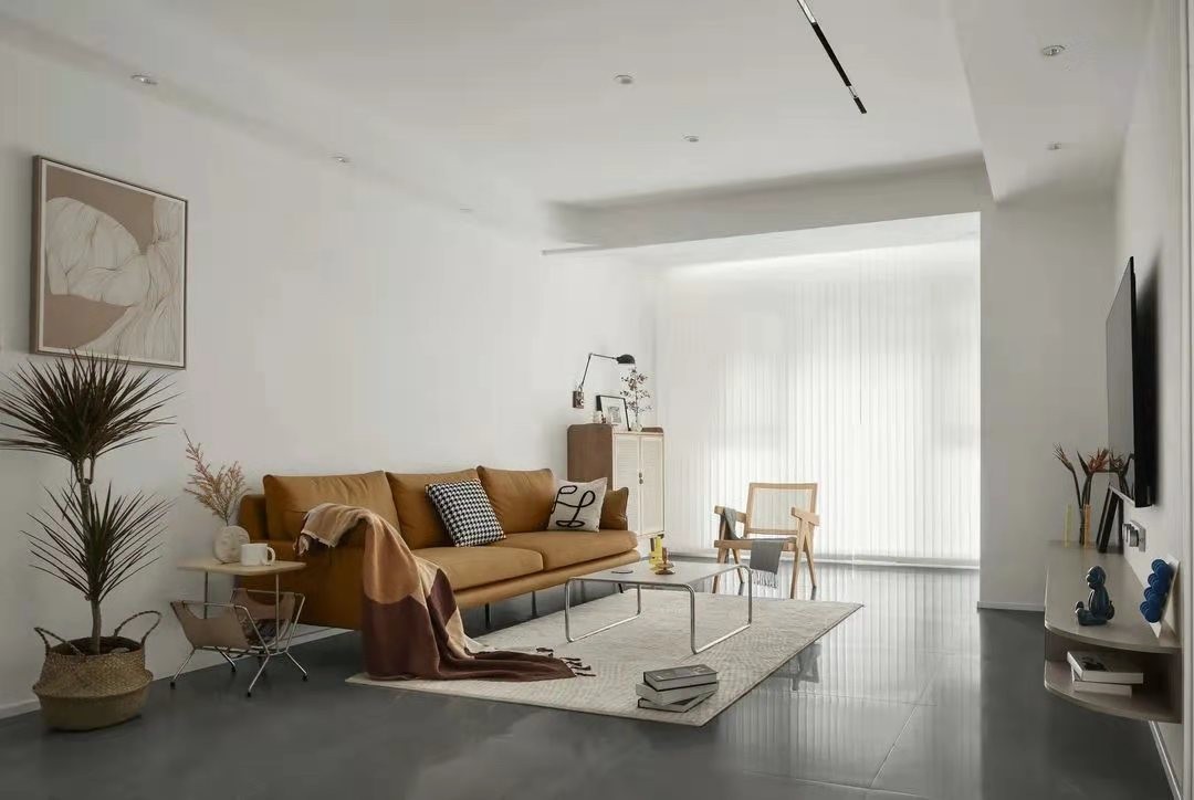 客厅和阳台打通,扩大了视觉空间,也有了较为自由宽敞的活动空间。墙面四白落地,简单耐看又提亮空间,加上灰色地砖打底和暖橙色沙发点缀,简洁大气又静谧舒适。