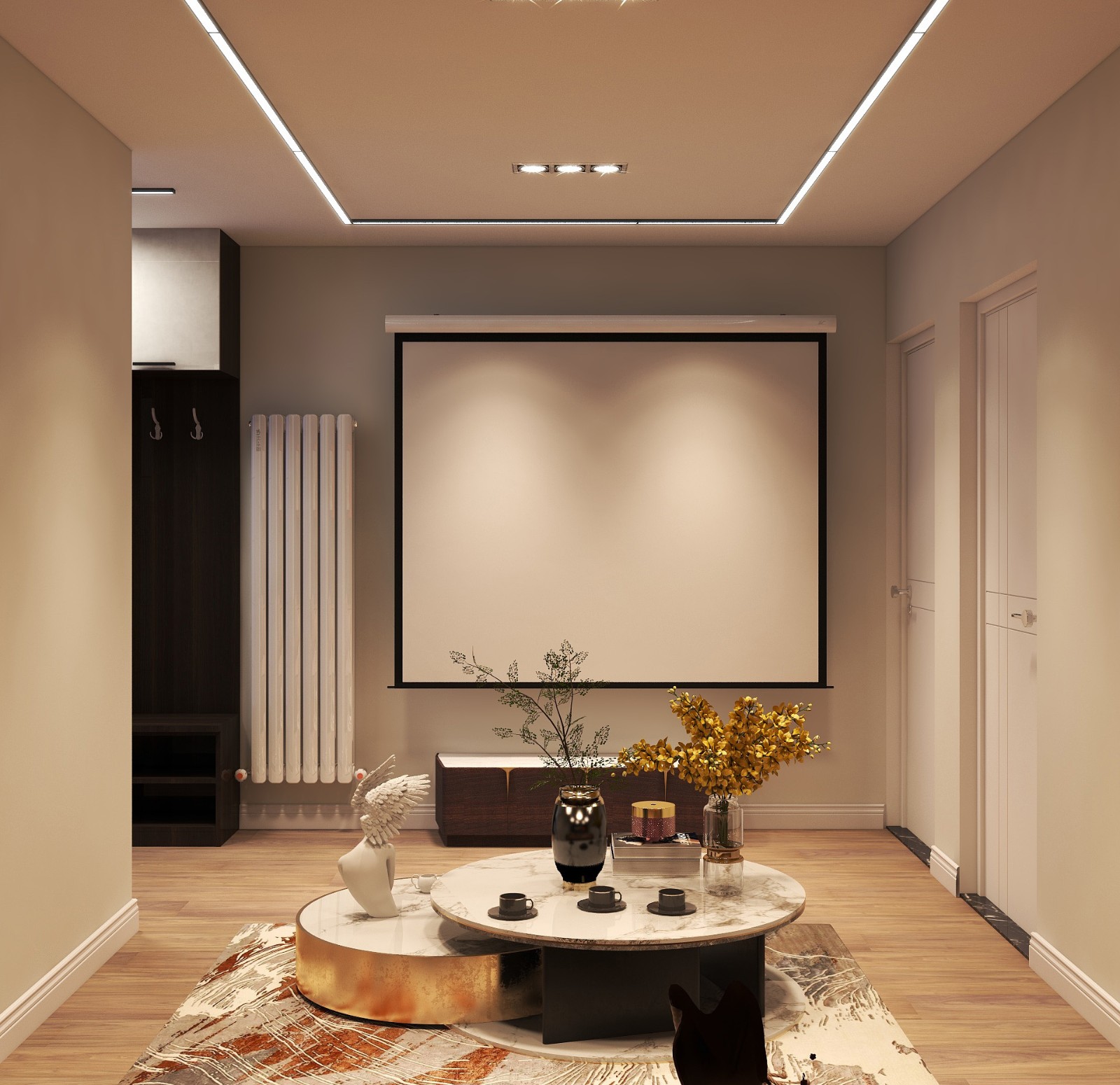 因为空间比较小,还是通往餐厅的主动线上,所有取消传统电视用幕布取代