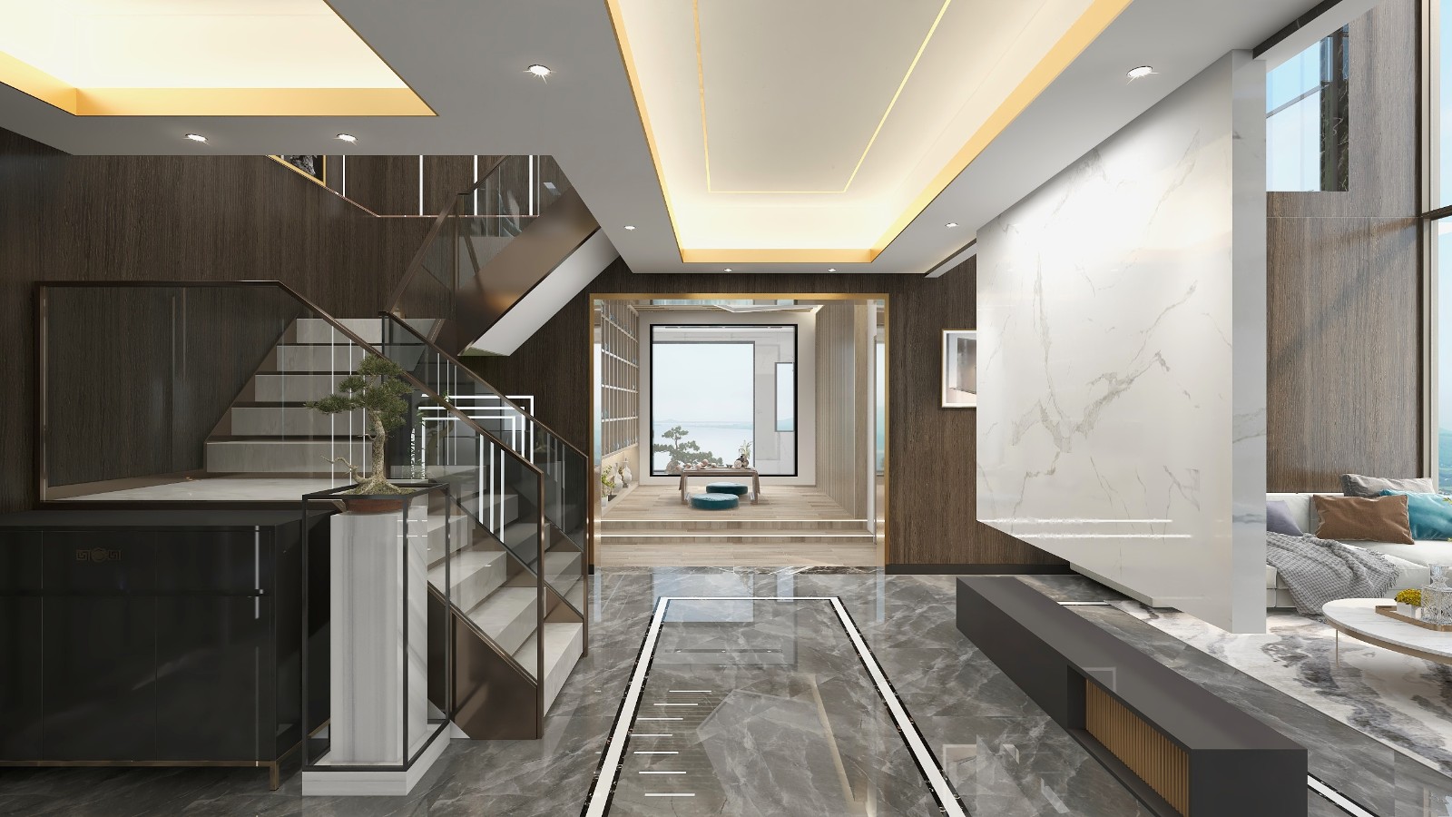 320平米的二层别墅定位为现代轻奢风格,以时尚亲和的色调为主,配以金色点缀,打造出了一个精致,简约的奢华空间。