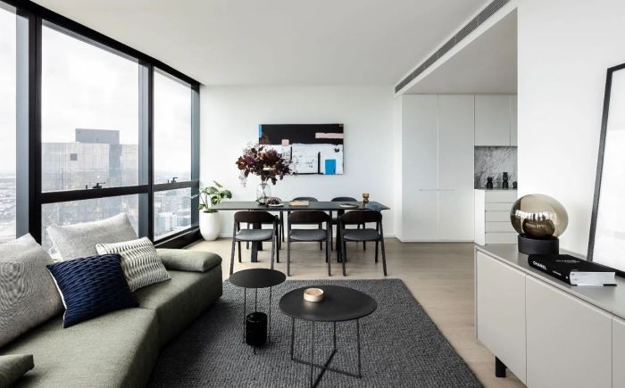 开放式的客餐厅用白色作为基调铺陈,墙体没有过多的粉饰,维持自然、舒适的都市生活理念。