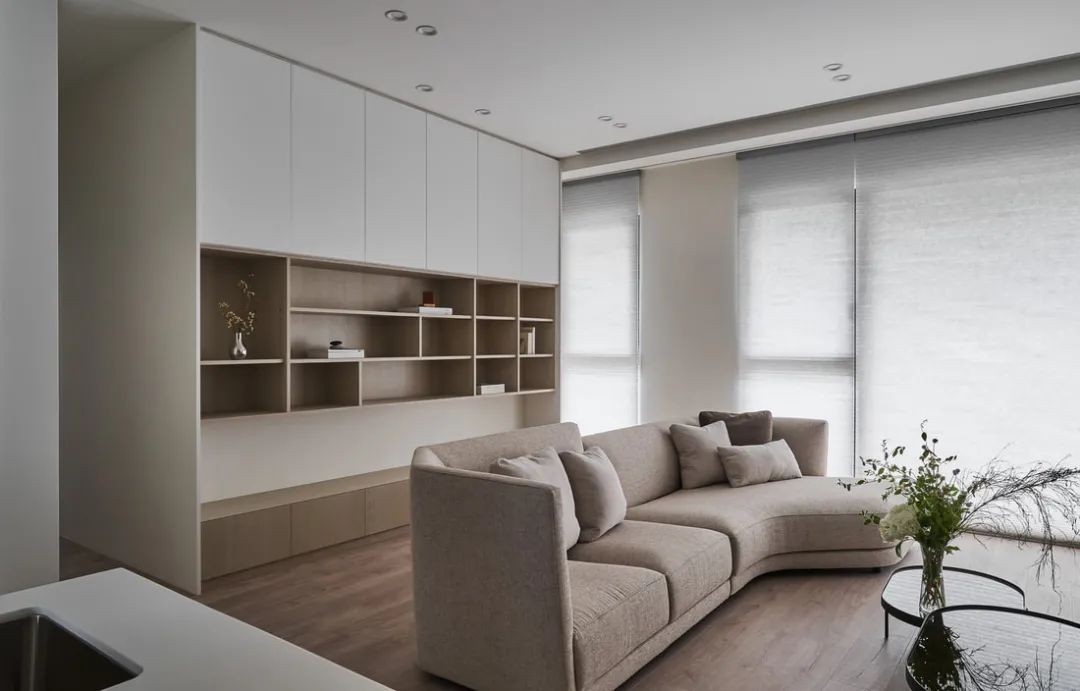 微微弧形的沙发在一个改造后的横厅空间中刚好适合,没有大量用来坐卧的家具,地板就是一家人用来谈心玩耍的***坐塌。