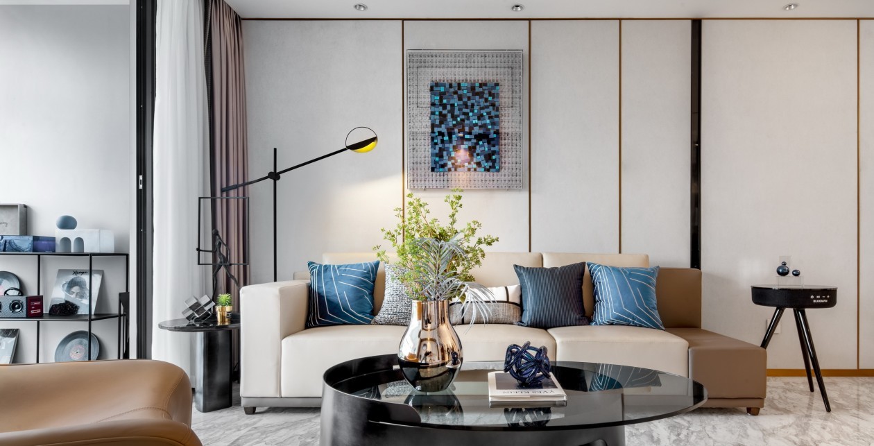 在打造出具有休闲领域感的空间后,用蓝色跳色点缀空间,延伸出无限艺术遐想。