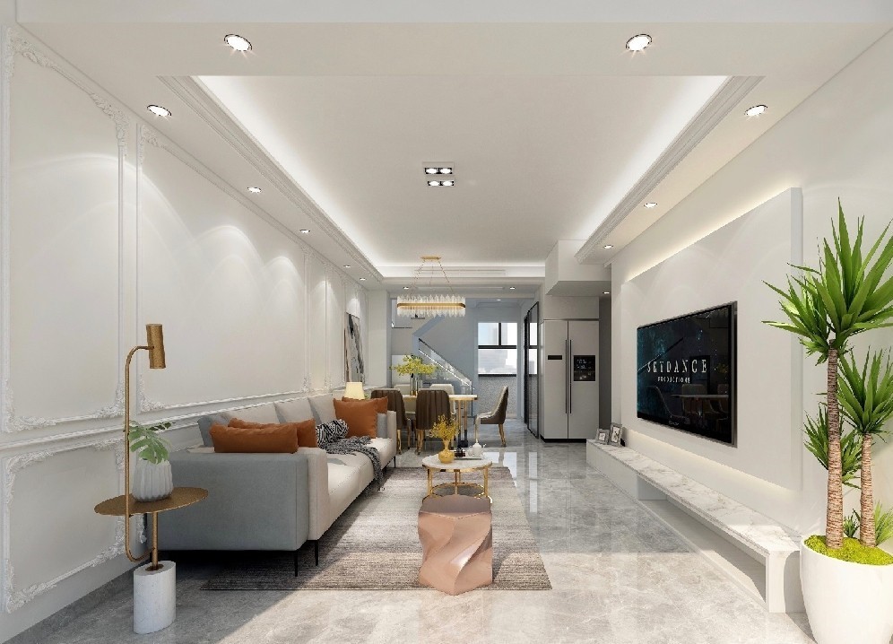 客厅,客厅沙发背景墙采用法式线条作为空间的亮点,电视背景墙用的是现代简洁的背景墙,承托整体空间现代轻法风该有的协调性和完美