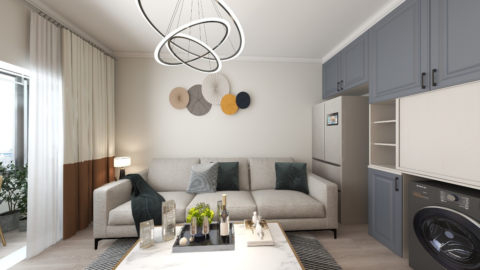 卫生间太小了,洗衣机没地方放,只能放在客厅,所以在客厅添置电器柜,合理收纳。