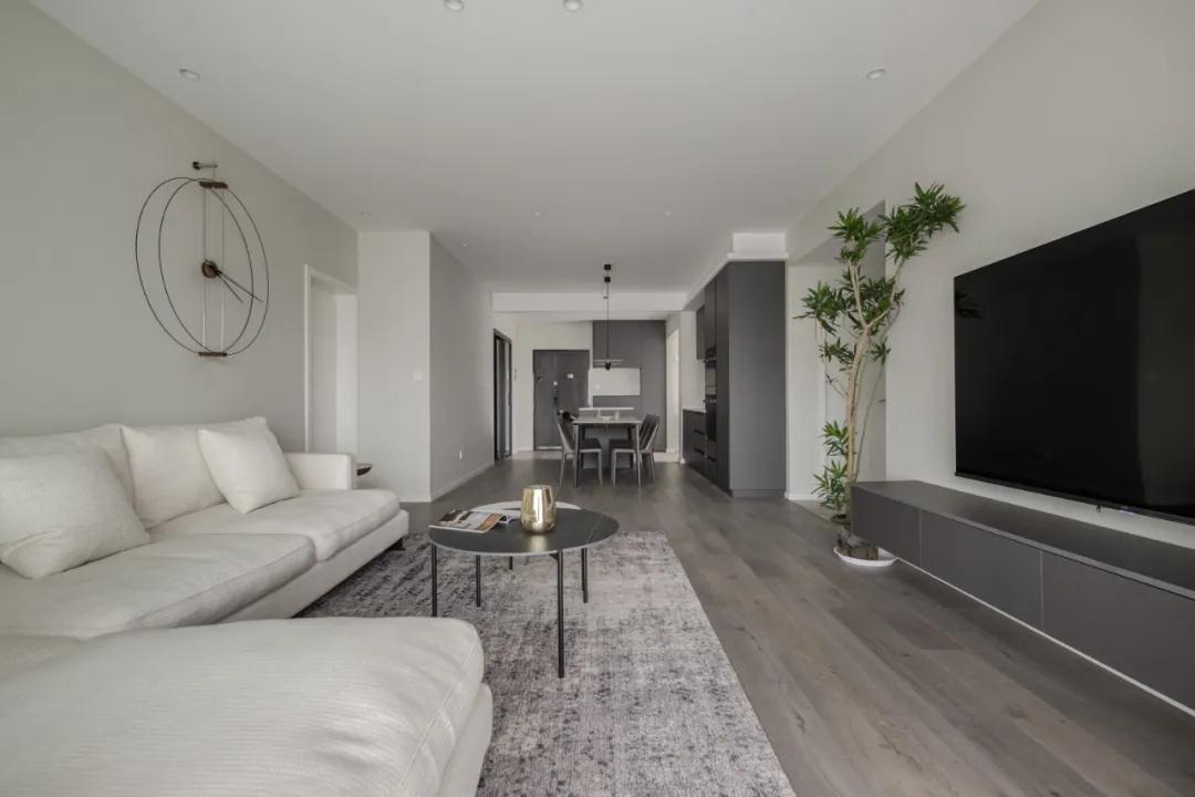 客厅以灰白色为主,呈现出简洁淡雅的空间氛围。