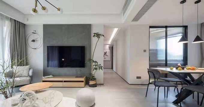 电视背景墙采用深灰的岩板+乳胶漆,两种材质结合,突出墙面层次感的同时更具质感