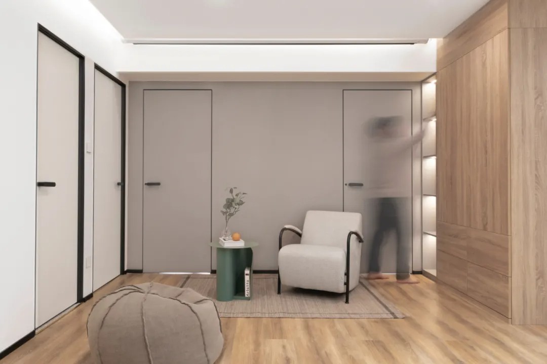 主卧采用全屋定制,设计师在每个空间中,都为这个五口之家未来十年的生活物品,预留了充足的收纳余量。