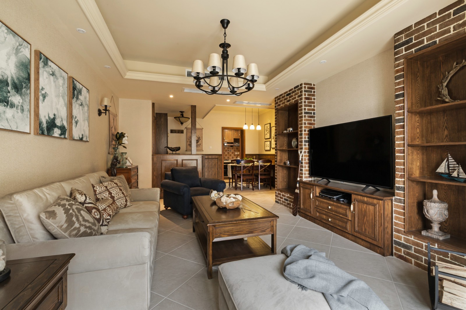 美式乡村风格的色彩以自然色调为主,绿色、土褐色最为常见;壁纸多为纯纸浆质地;家具颜色多仿旧漆,式样厚重;设计中多有地中海样式的拱。