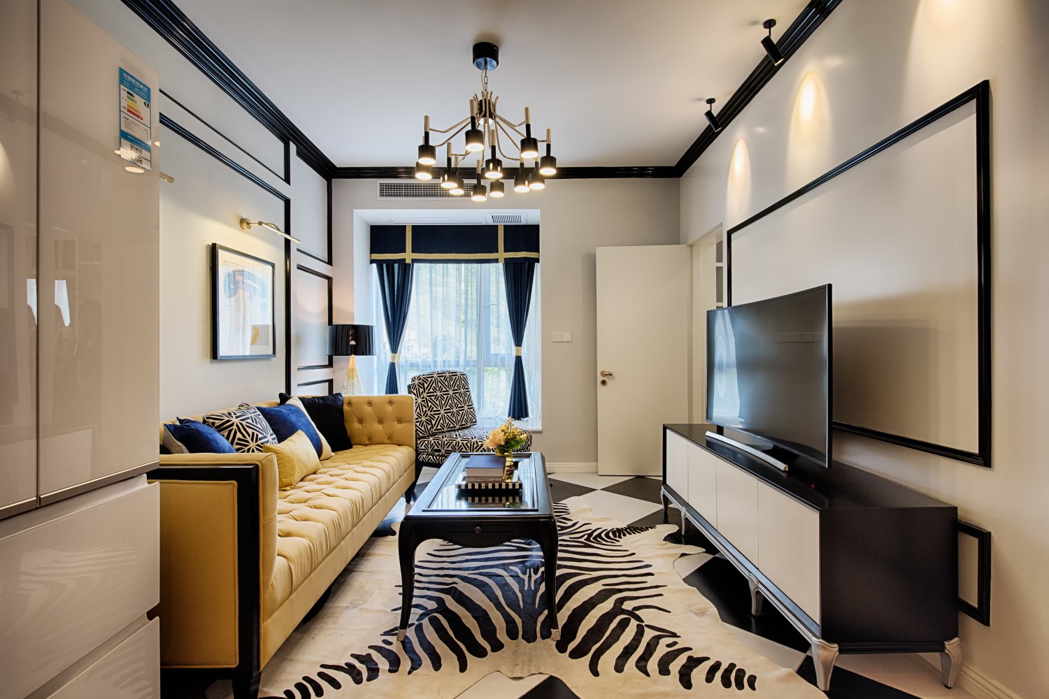 白色墙面配上黑色实木线条,颜色对比大胆
