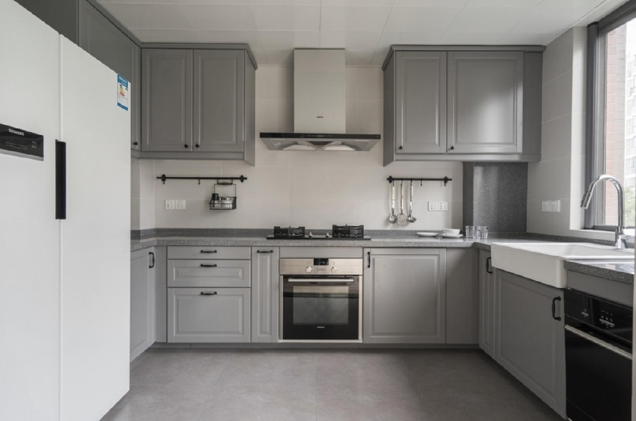 中厨与餐厅之间用移门隔开,可以阻挡油烟味飘至整个房间,同时也不影响与餐厅里的人沟通,浅色的墙砖与灰色的橱柜,显示出不拖泥的干练,不同于常规厨房水槽不锈钢设计,这里的水槽利用的陶瓷材质,凸出台面,使得主人更加好打理。