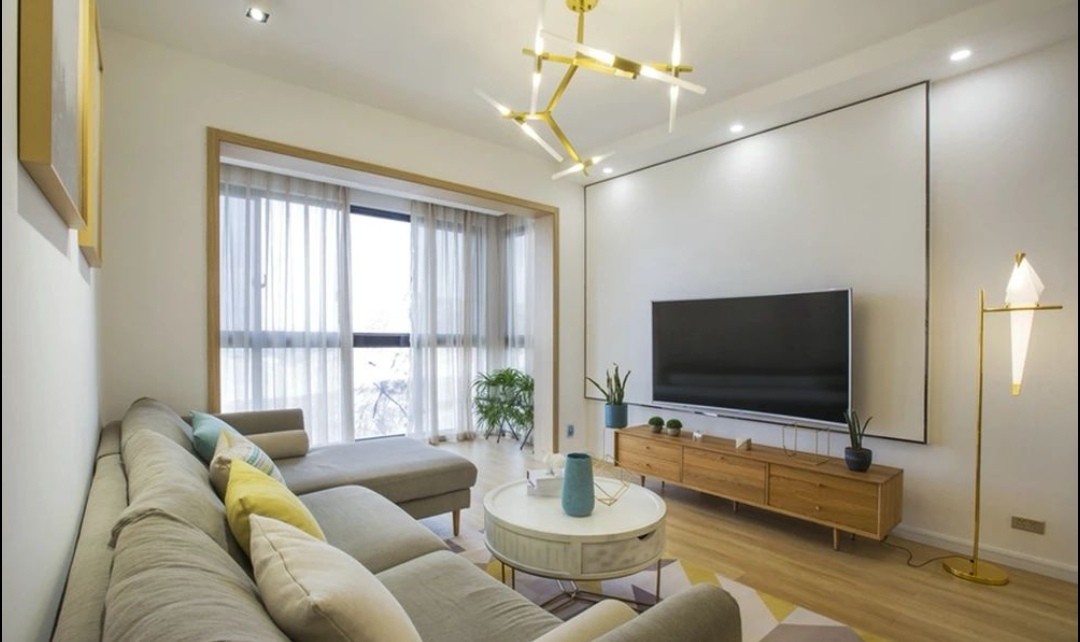 电视背景墙没有多余的繁杂的设计,黑色边框加原木色家具,简约不单调。
