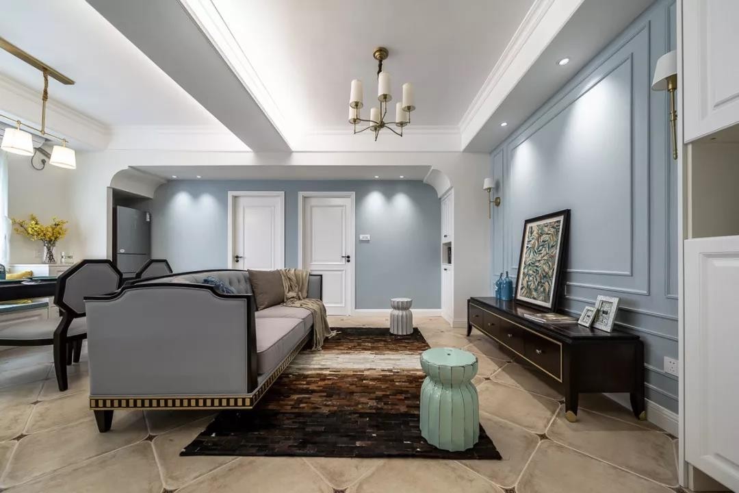 在浅棕色仿古砖地面基础,搭配上蓝色的边框造型电视墙,呈现出一个独特优雅的美式空间感。电视墙两侧是白色收纳柜,中间是蓝色的边框造型基础加入壁灯,在顶上的筒灯照射下,呈现出一个温情优雅的浪漫气质。