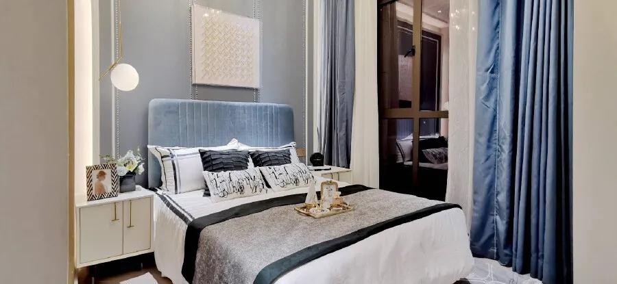 主卧室床头墙以硬包造型的背景墙,布置上一张布艺靠背的床铺,还有儒雅端庄的床单与窗帘等软装布置,让卧室氛围显得现代优雅而华丽舒适。