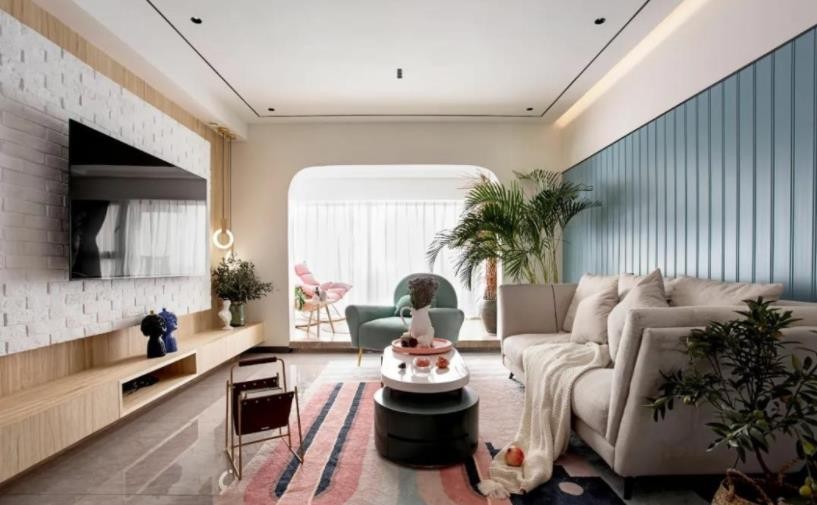 步入客厅,仿佛掉入了马卡龙色系的世界里。桃花粉、薄荷绿、雾霾蓝,与自然木色和雅致白色相和谐,交织成柔和清新的空间氛围,甜蜜也在悄悄发酵。 客厅与休闲阳台连通,以拱形门洞为隔断,艺术感满满,成为一道靓丽的风景线。 电视背景墙以柔粉色拼接木饰面板,搭配白色文化砖,显得甜而不腻。