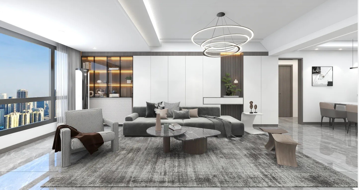 客厅整体以黑白灰为色调搭配,简单大方。