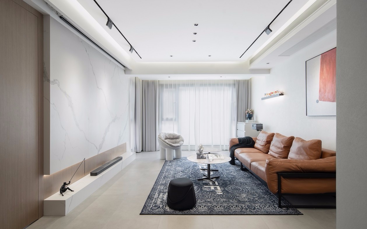 用银梨色木饰面、鱼肚白岩板、白术漆构成整个空间,让客厅整体实现一种一尘不染的气息。