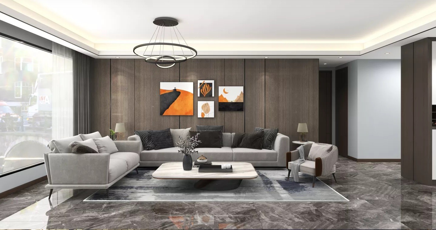 二厅整体色调为灰色,背景装饰画为橙色使整个空间显得活跃起来。