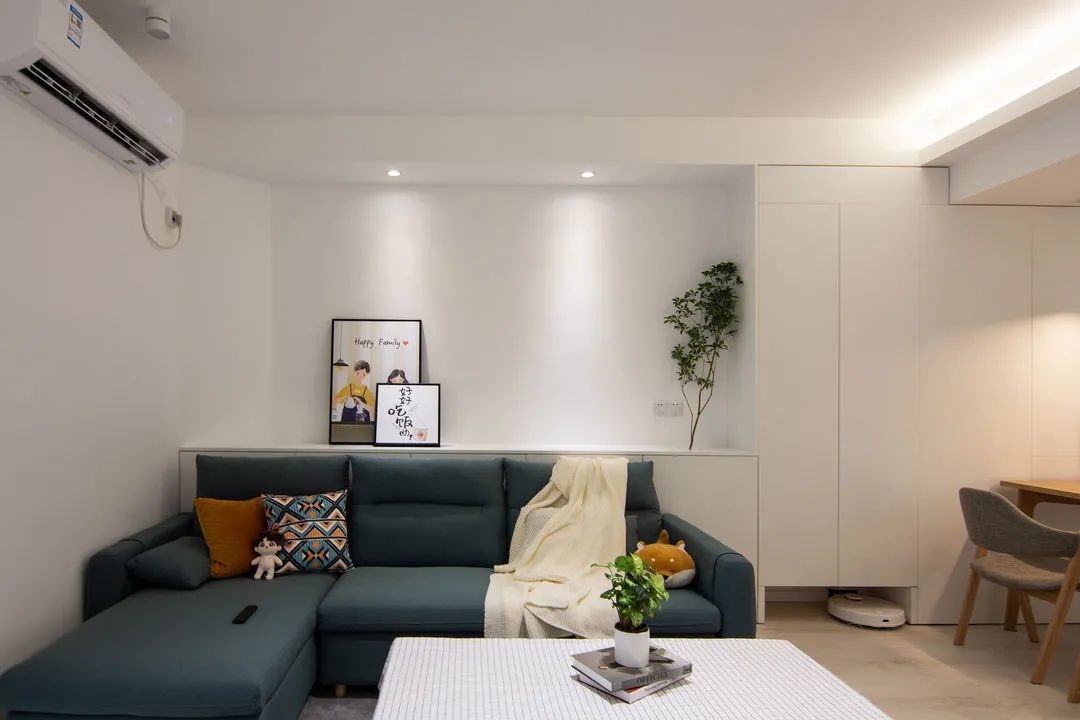 客厅,客厅里都是大白墙,吊顶上筒灯灯带照明,无主灯设计不仅让空间看起来宽敞,还增加了层次感。布艺沙发看起来更舒服,沙发设计了一排收纳柜,增加收纳空间。