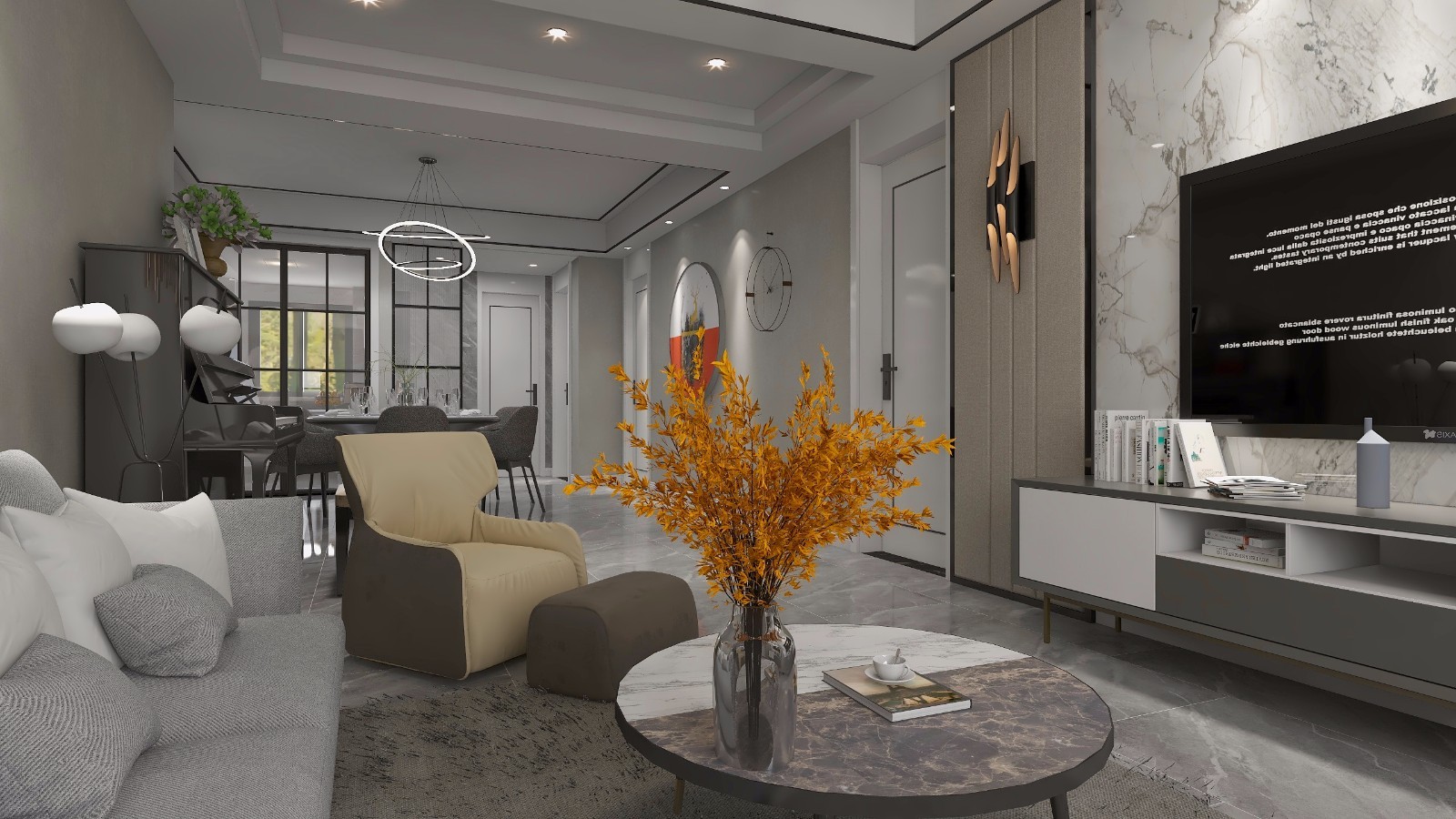 客餐厅做的现代轻奢风格,大面积的黑白灰组成,整体看着舒适简约,业小孩学琴,充分考虑把钢琴放在客餐厅之间,平时不谈也可做装饰,电视背景墙作为客餐厅的亮点,用大理石和硬包搭配,有质感,有颜值