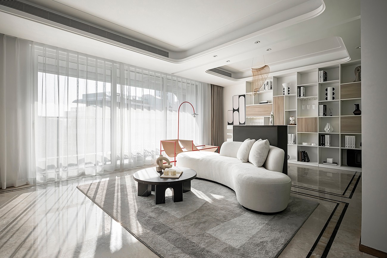 设计师选取白色来定义空间主色,以搭配温润木质,黑色矮桌茶几,纯白色布艺沙发,整排的不规则书架,白色在整个空间内一点也不无聊,硬软装的结合,流露出简约的美感。