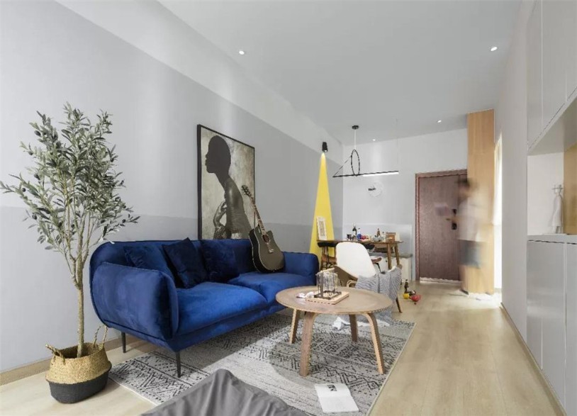 这是一套63平米的小户型,整体空间以简单大方为主,通过北欧舒适的软装布置,把这个小空间装扮得充满温馨惬意的气质感。简洁的客厅,沙发墙以不同灰度的灰色墙面作为墙脚与墙身搭配餐厅的木质餐桌,靠墙是定制的卡座,搭配铁艺脚的餐厅背景墙刷了一个黄色三角形拼色墙,结合筒灯的设计