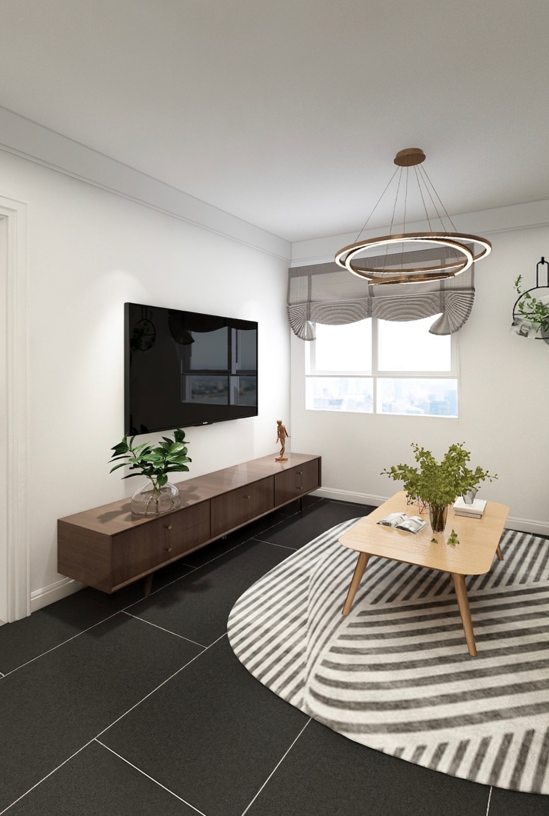客厅空间运用了白色和原木色饰面家具和背景墙 呈现清新自然。