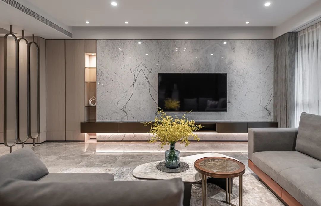 大块真石的大理石砖铺贴了出了整个电视背景墙,而带有小雕刻的大理石纹理,看起来非常的奢雅。在电视墙的底部水平镶嵌出金属矮柜,以古铜色搭配实木褐棕色,看上去简约大气。