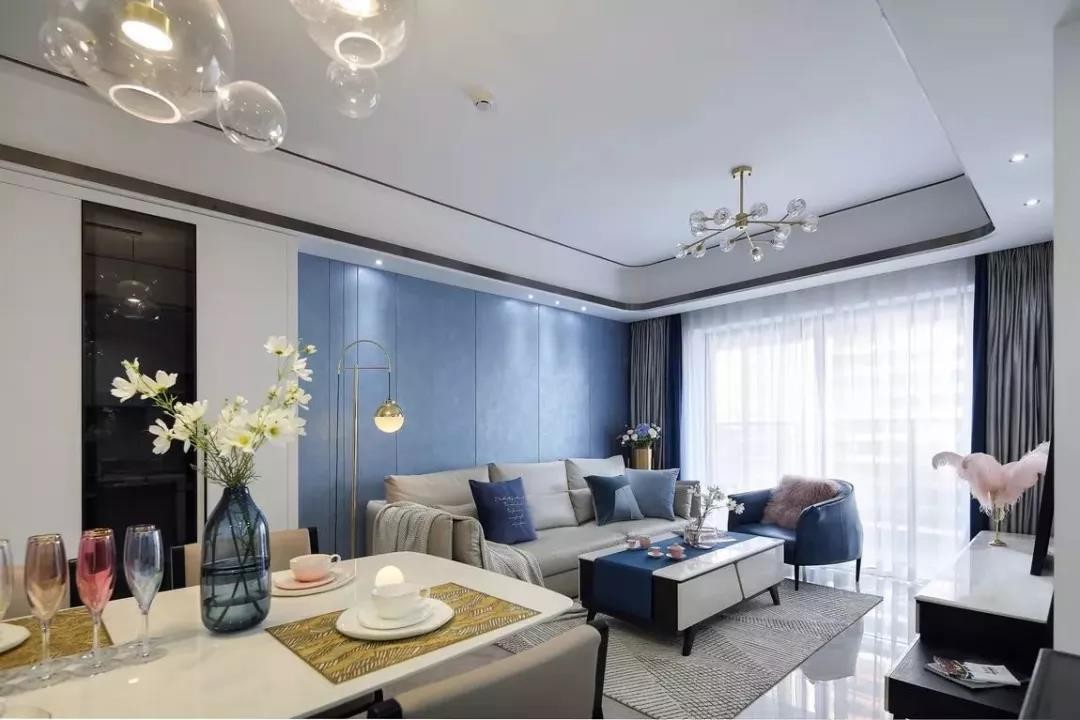 客厅的电视背景墙做了蓝色的布艺硬包造型,也和单椅、抱枕等相互呼应,浅色调的沙发和窗帘搭配白色的地砖,整个客厅显得格外明亮。