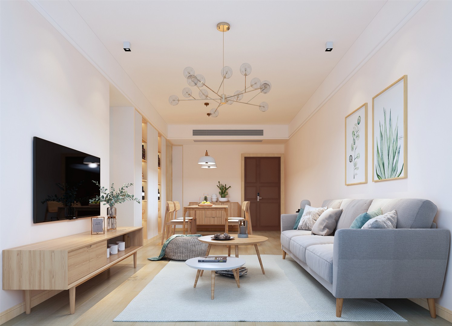 餐桌是四人为主的原木色,酒柜平时摆放主人家工艺品或者一些酒水等。入户门旁边用矮柜充当整个家庭的鞋柜,上面可以放一些女主喜欢的花花草草等。
