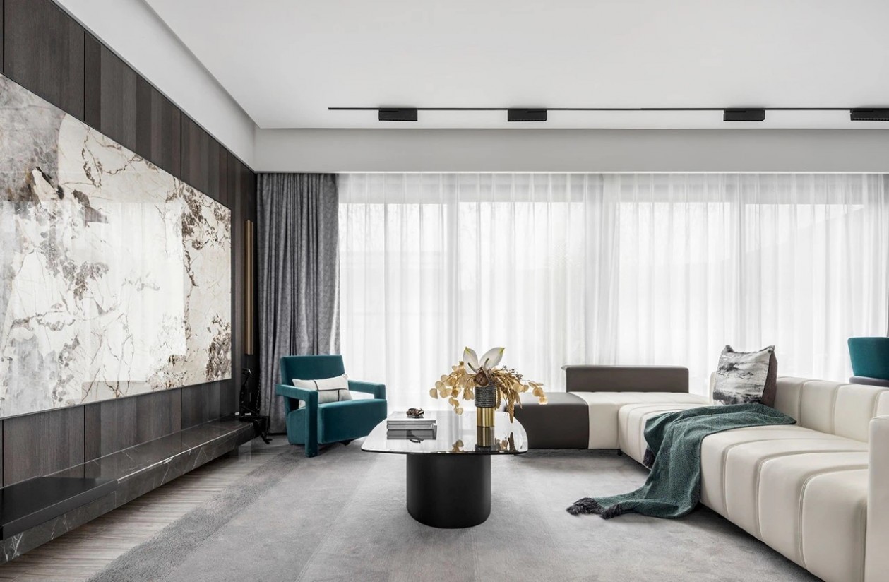 深刻挖掘现代人的审美需求与生活方式,摈弃一切冗余,保留最核心的设计表达,运用皮革、大理石、哑光拉丝金属等材质,营造出一种现代+轻奢的居家氛围,给居住者带来极简、雅致的居住体验。