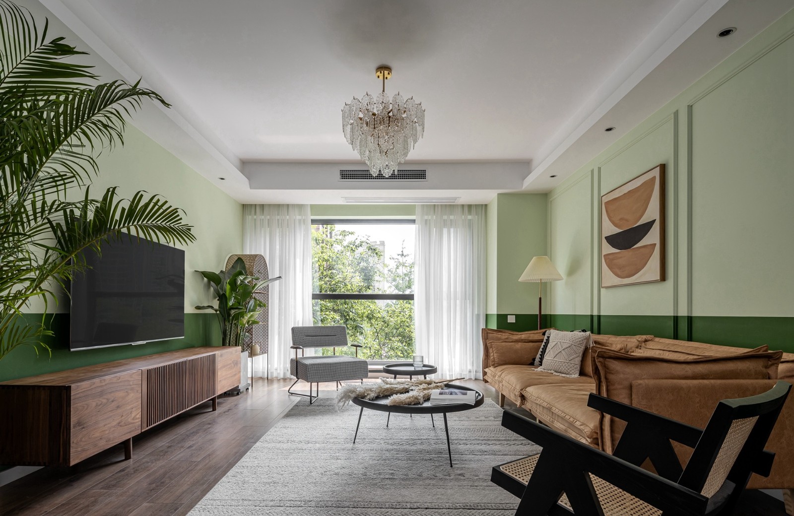 我们从材质、色彩表达和家具风格上营造出了一种度假感受。用隐形收纳柜的方式满足收纳功能,让空间保持整洁和美感。在餐厅增加西厨,以满足女屋主对烘焙的喜爱和增强家人的互动。