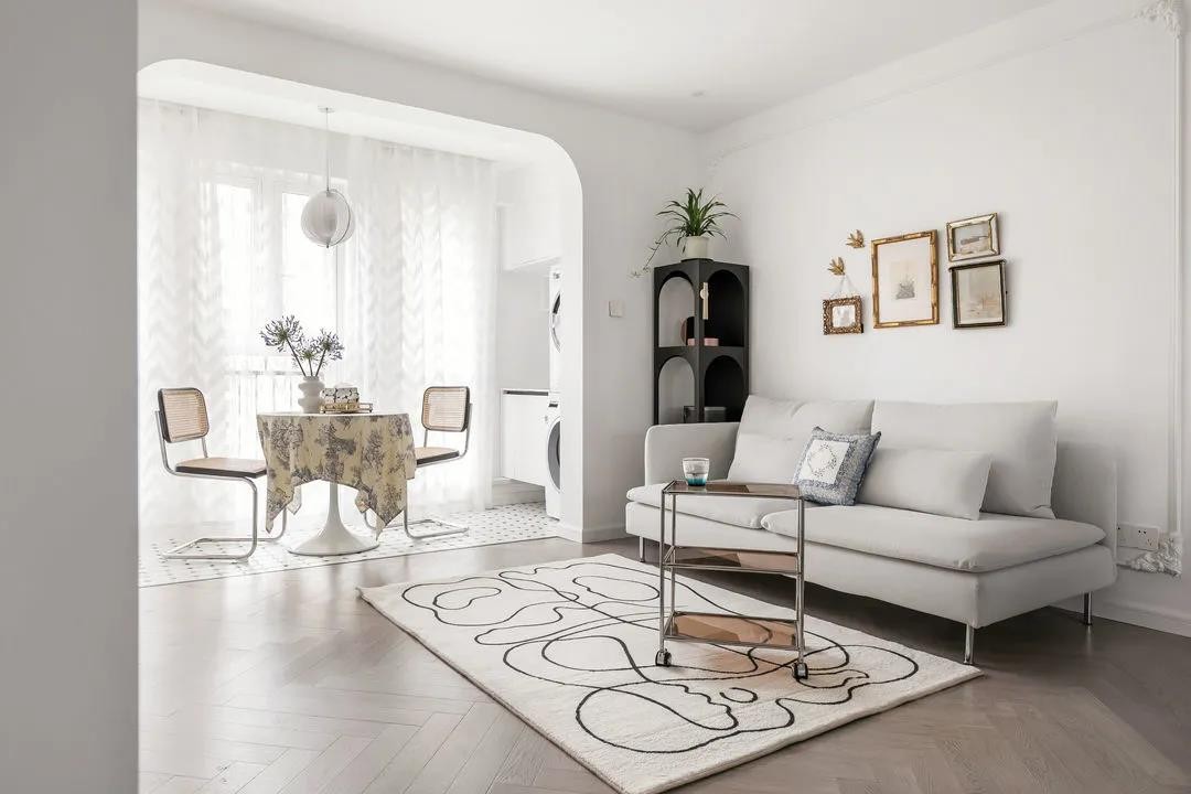 人字拼的地板,马赛克的阳台地面。对法式的理解,是色调上的优雅,细节上的精致。阳台包进客厅,顶上梁体弧形修饰,让门框自然成为一个过渡。