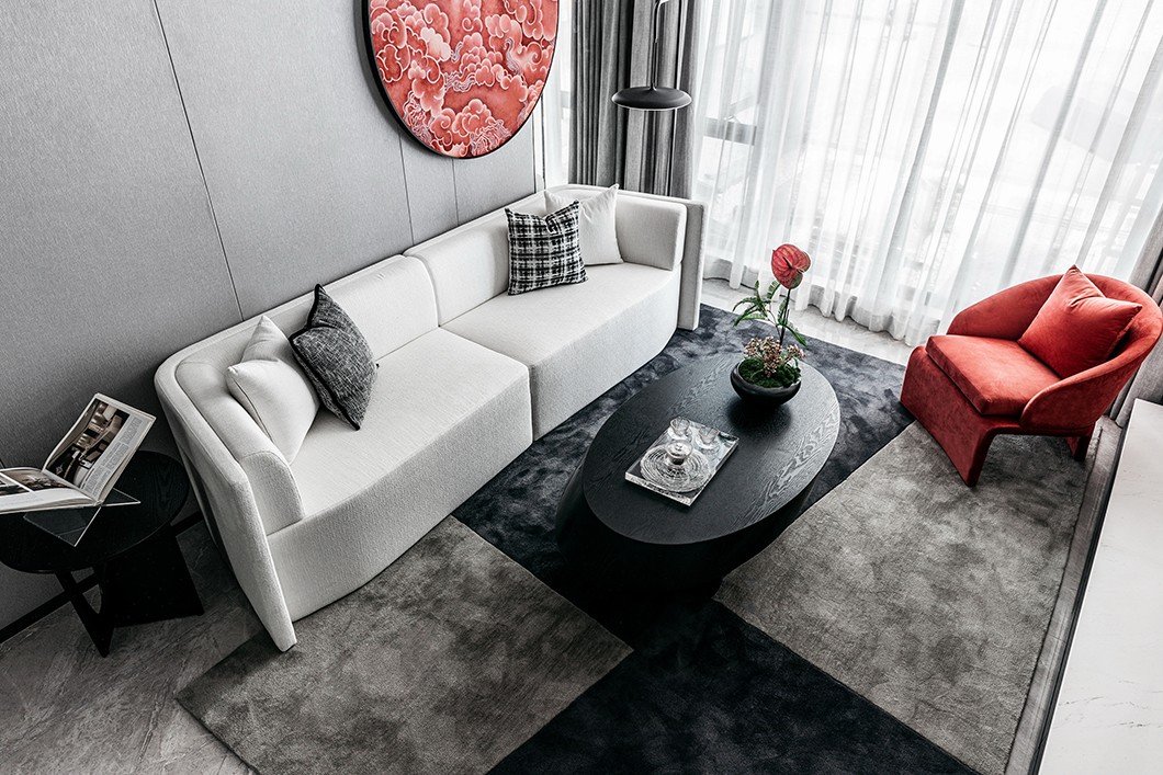 红色祥云图案注入一抹雅致的东方韵味,与单人沙发椅高低呼应,使得空间色彩更为平衡而不显呆板。