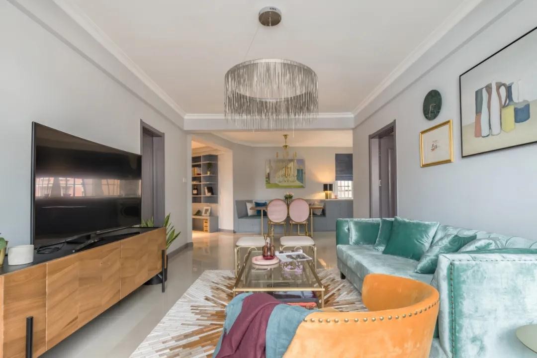 这是一套110平米的不规则老房子,装修改造后以现代风的硬装空间,在家具搭配方面加入复古风的设计元素,布置精致华丽的精致 质感,合理的空间设计利用,营造出一种华丽舒适的优雅空间感。
