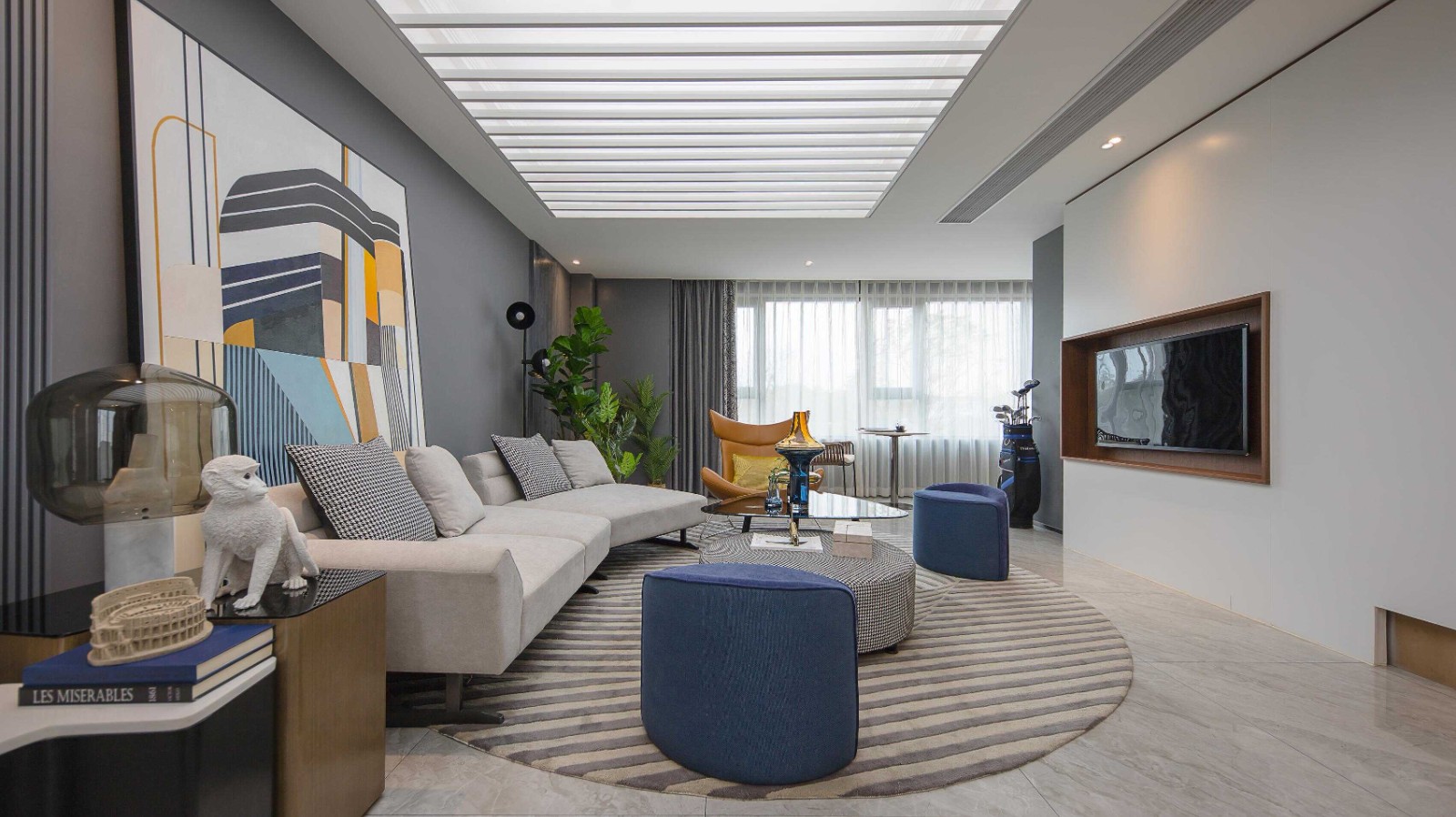 整体设计极其符合人体工学设计,呈现艺术气息的陈列物件和插画,让享受美好家庭生活的同时,也能够获得更多的生活情趣,让一家三口能够在客厅中独享亲子时光。